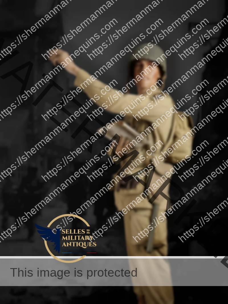 Le mannequin est vendu, entièrement habillé et équipé de la tête aux pieds, support inclus, arme non fournie et comprends toutes les pièces originales suivantes :- Casque MKIII avec jugulaire élastique, en toile OD#3, fabrication “CCL” daté 1944″, taille 6 3/4 + filet de casque bi color marron et vert, petite maille, fabrication anglaise