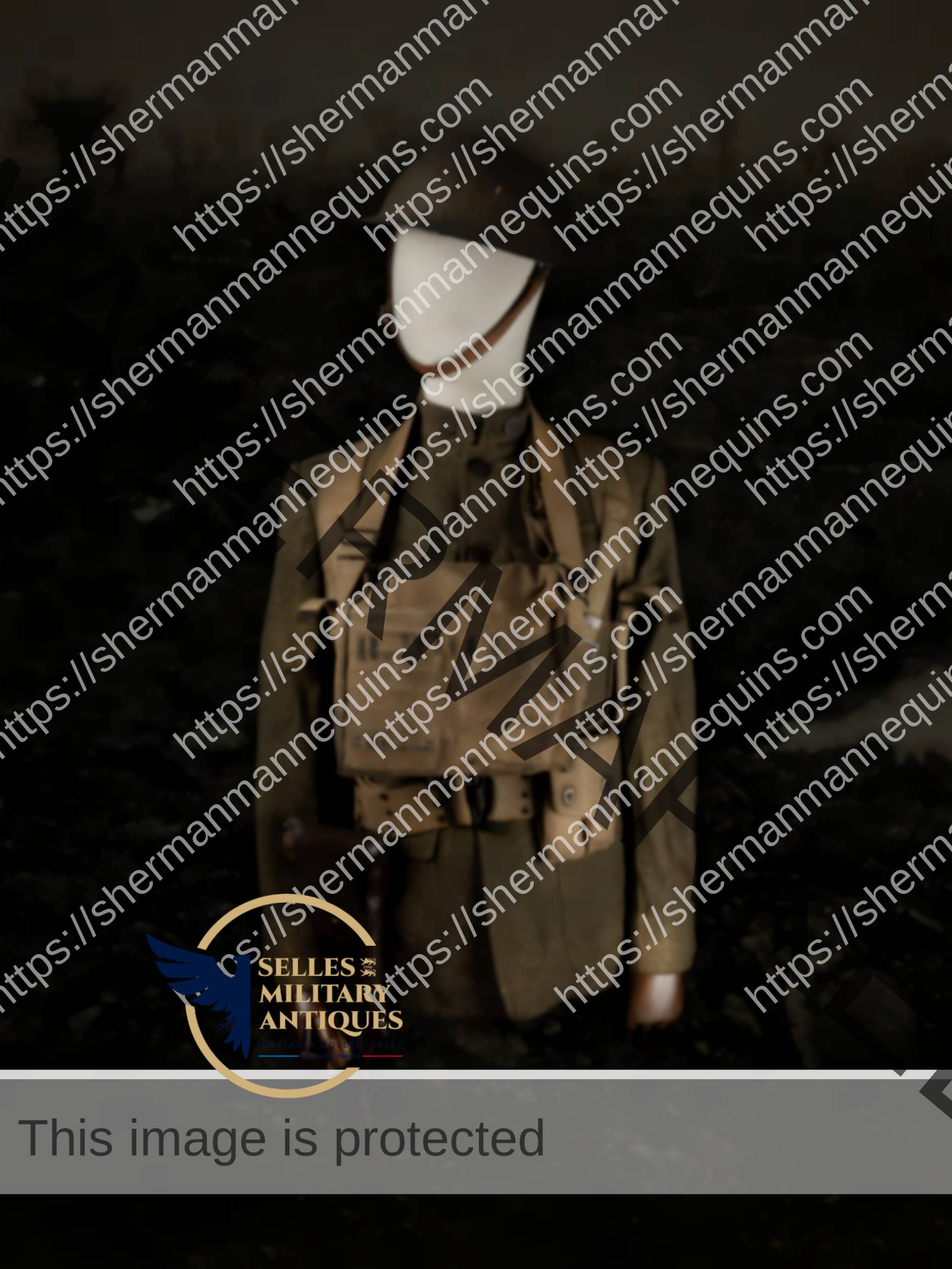- Veste M-1917 en laine avec étiquette papier (datée 1918, fabrication “Lenigan Unifom Co., New York”), disques de col (U.S. + infanterie compagnie “K”) et insigne divisionnaire d’épaule de la 7ème division d’infanterie + chevron